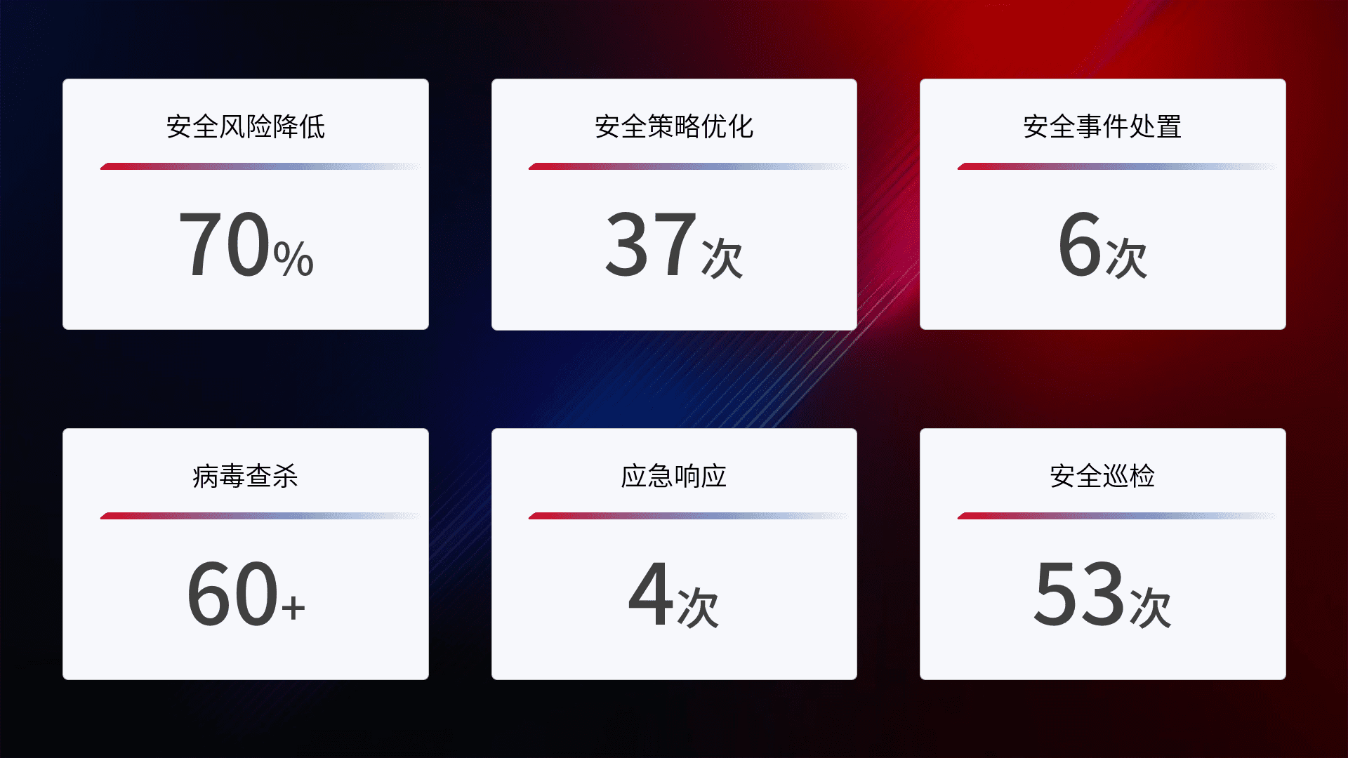 提供全面的安全事件报告体系,,,包括处置报告、、周报、、季度和年度总结,,,结合持续监控,,,,帮助客户深入了解网络安全状况。。。